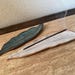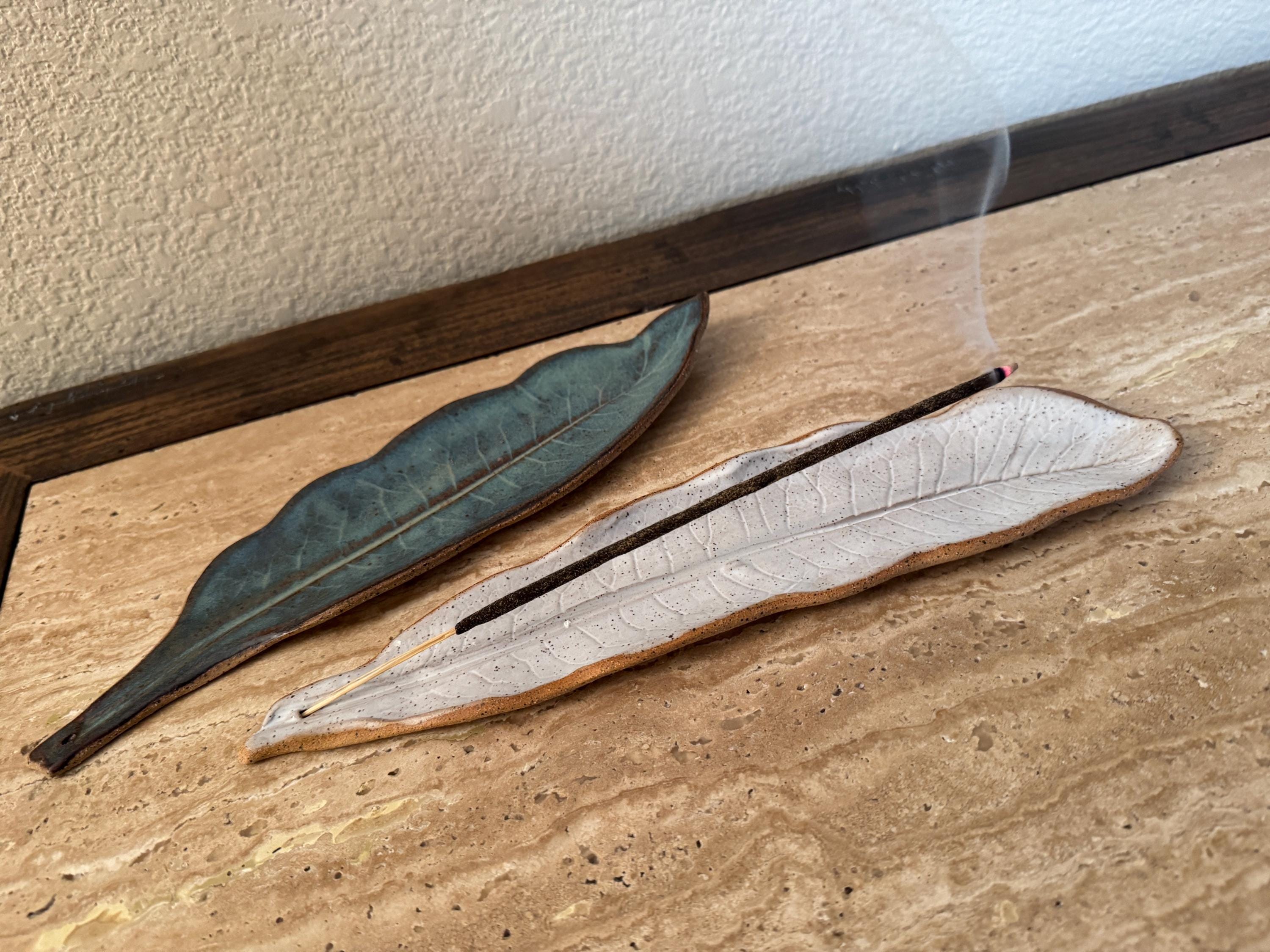 My handmade ceramic stoneware leaves are made by imprinting real leaves grown in my Colorado garden, creating a unique piece from nature. This leaf is made from a horseradish leaf and shaped into a shallow dish with a hole to hold an incense stick. In addition to functioning as an incense burner, it can be used for serving food items or displayed as a unique decorative item in your home. (Incense not included) As this is a handmade item, slight variations in size and color are to be expected. Some are made from speckled stoneware clay and some from white stoneware clay. Dimensions are approximately 10.5" to 11.5" long by approx. 2.5" wide.