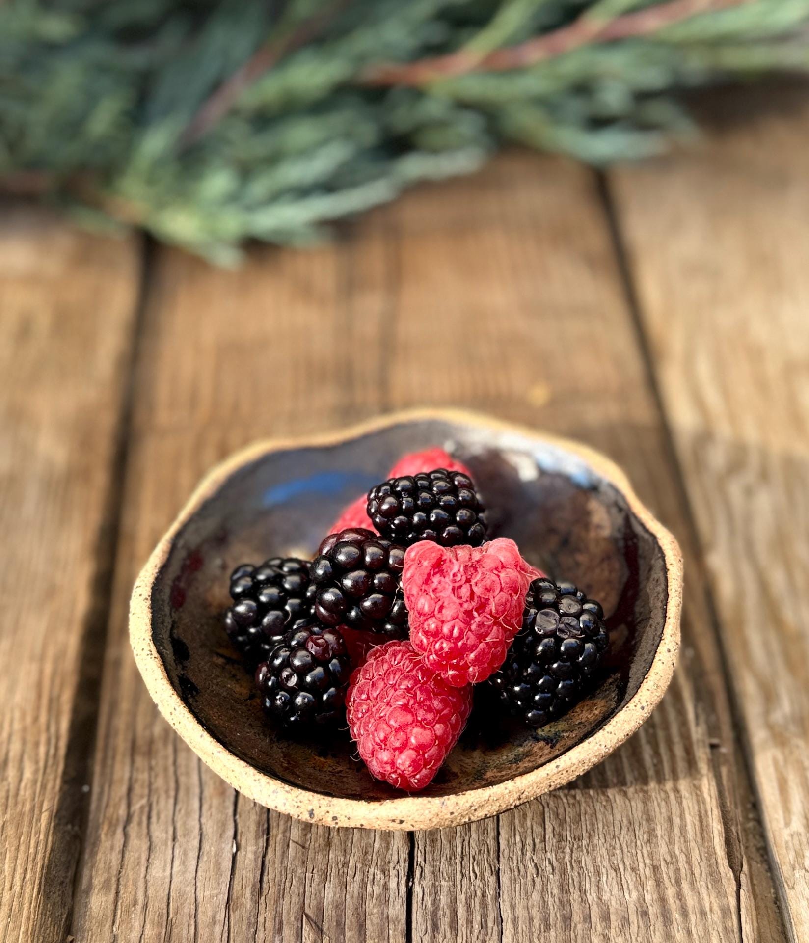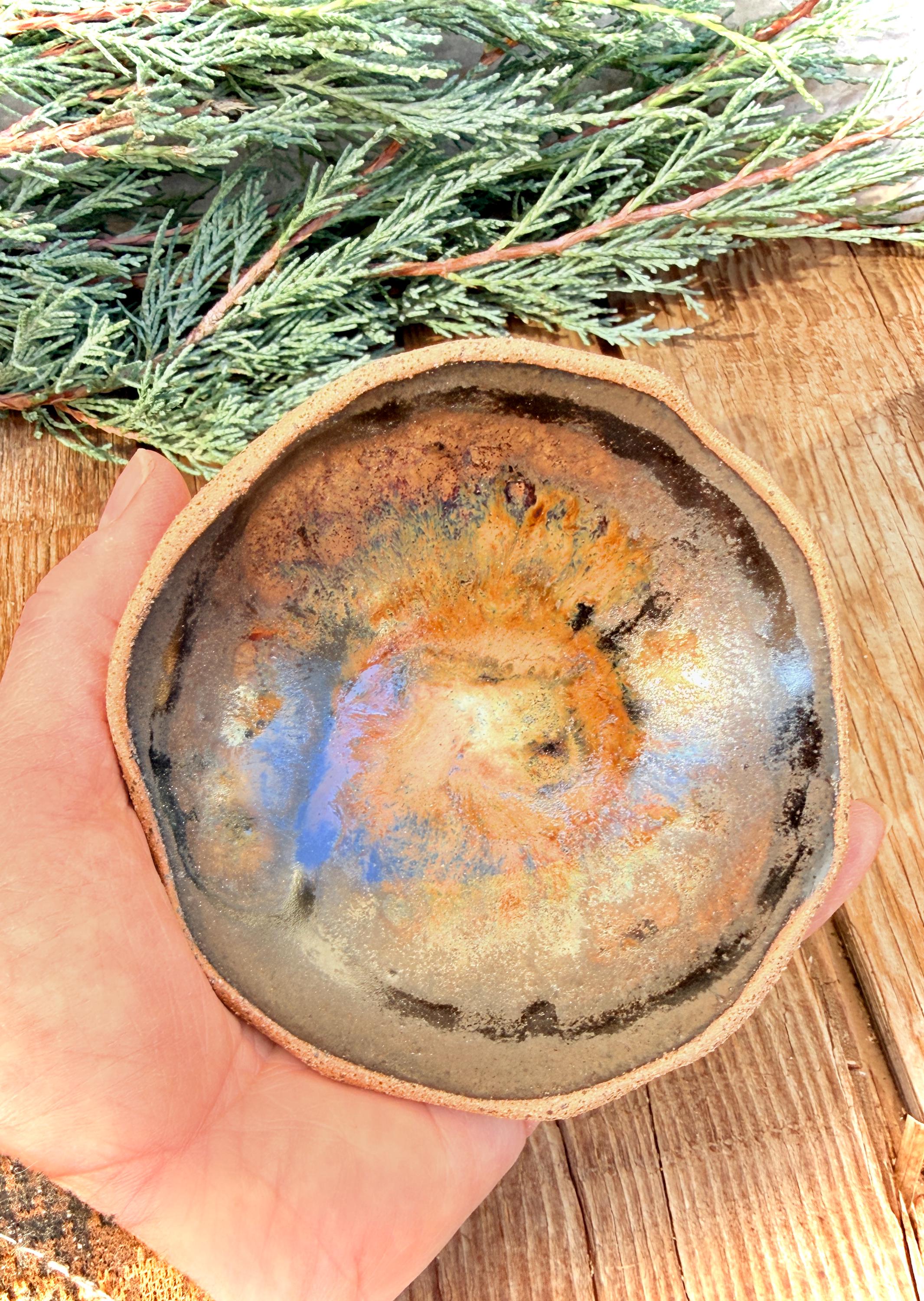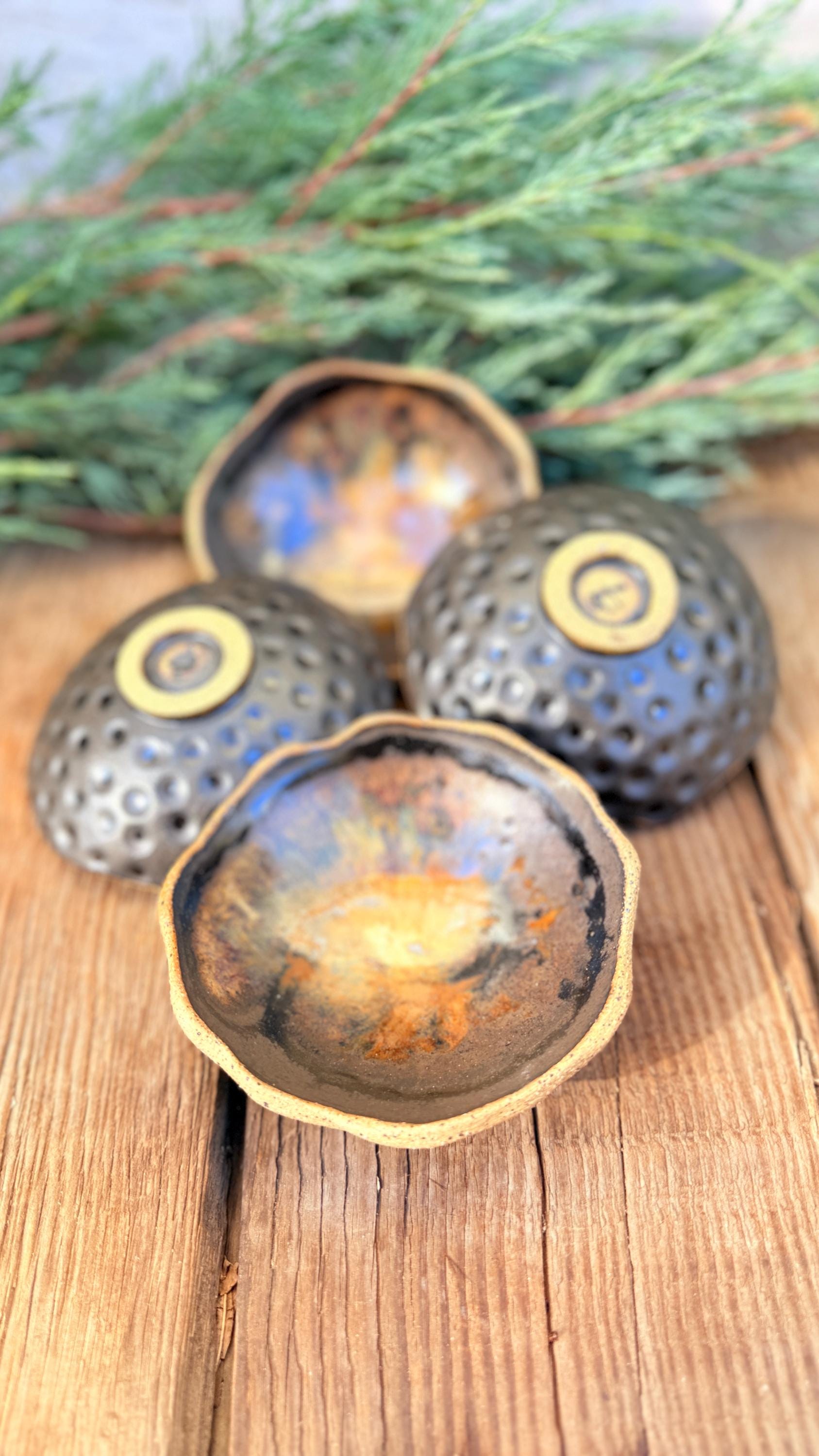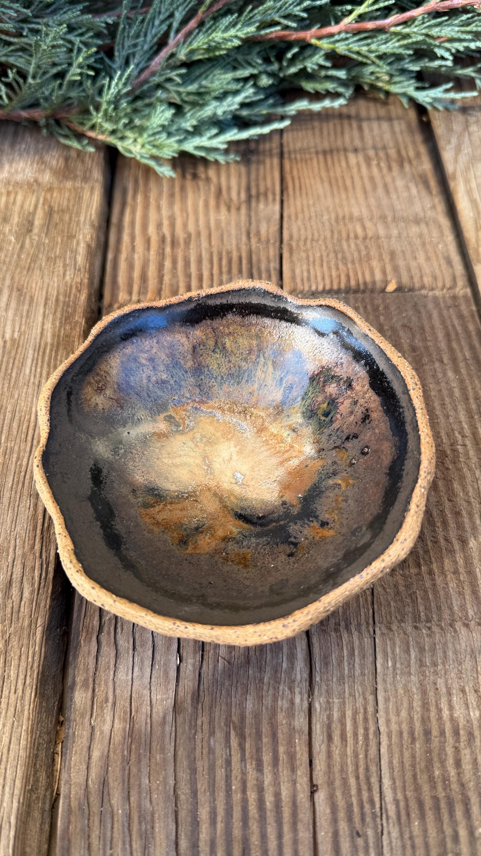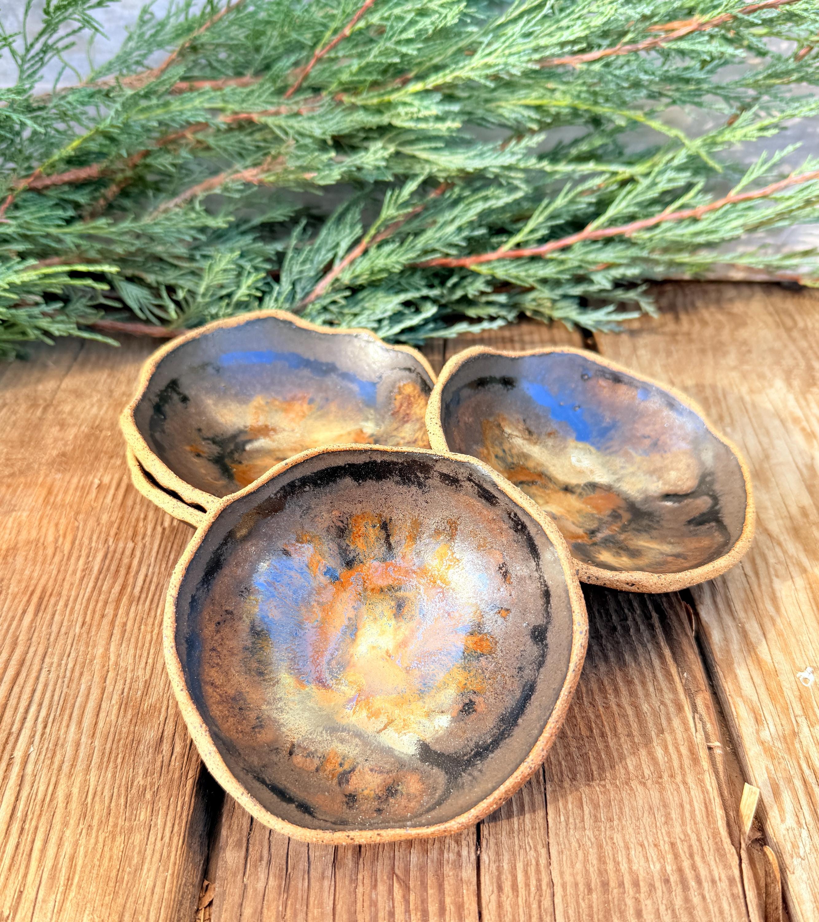 This set of 4 hand-built, organically-shaped dipping bowl is handmade in my ceramic studio from speckled stoneware clay and glazed with a beautiful dark wrought iron semi-matte glaze with brown/tan glossy accents on the inside of the bowl. They are ideal for dipping sauces, nuts & berries, condiments, or as unique decorative pieces for the home. These small bowls hold about 2 ounces of liquid each and are microwave and dishwasher safe. They are approximately 4" wide and approximately 1.5" high.