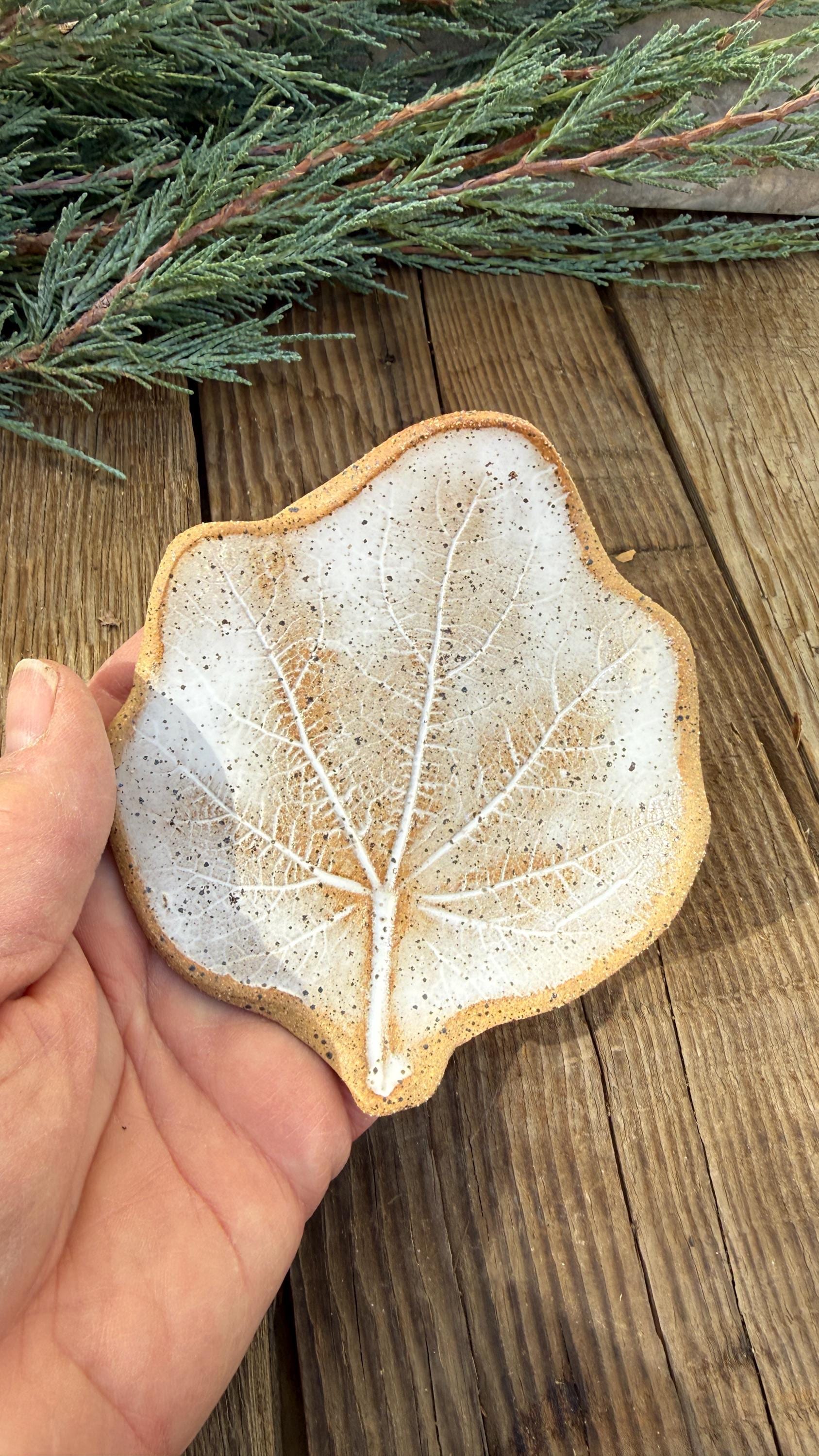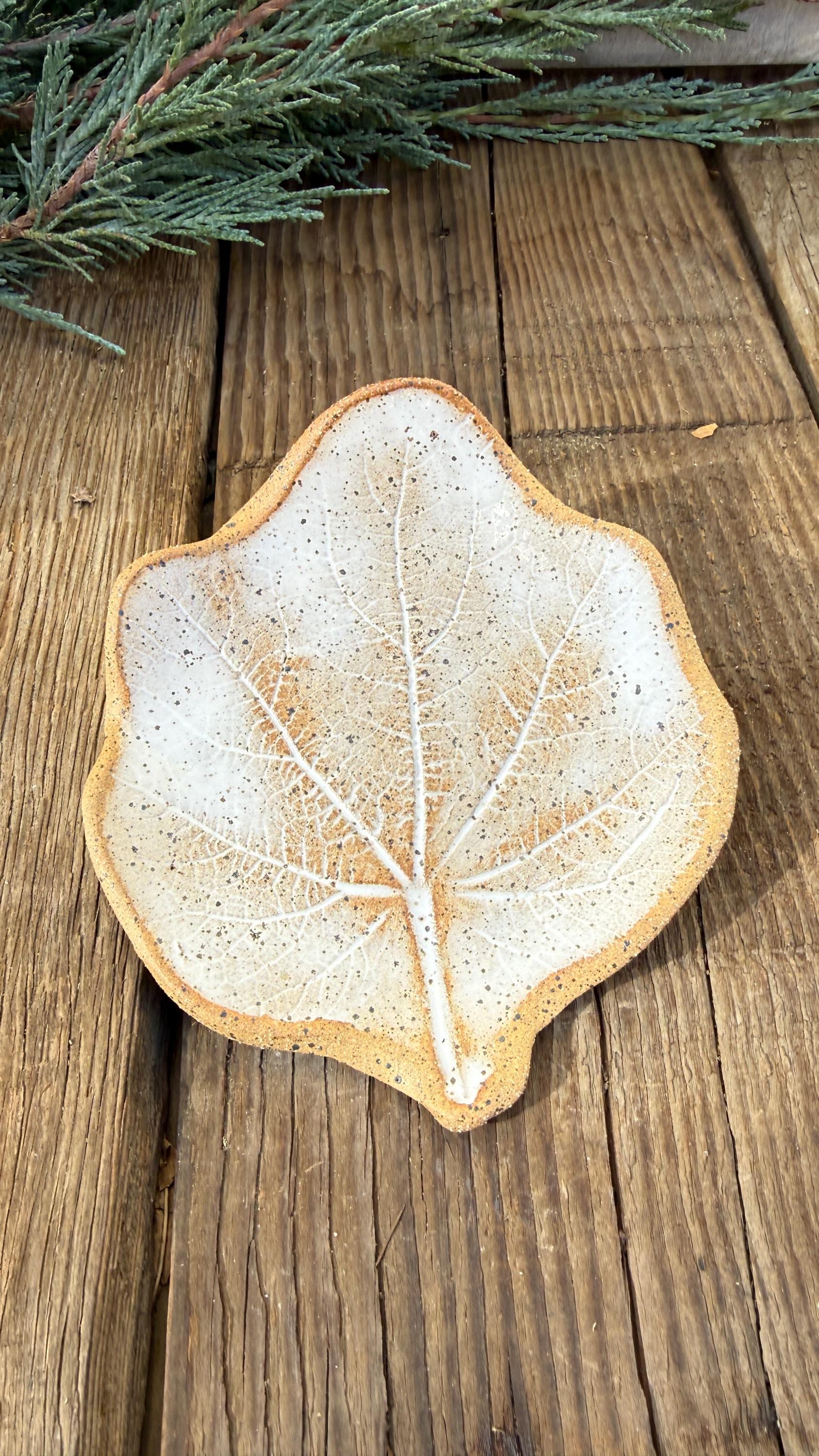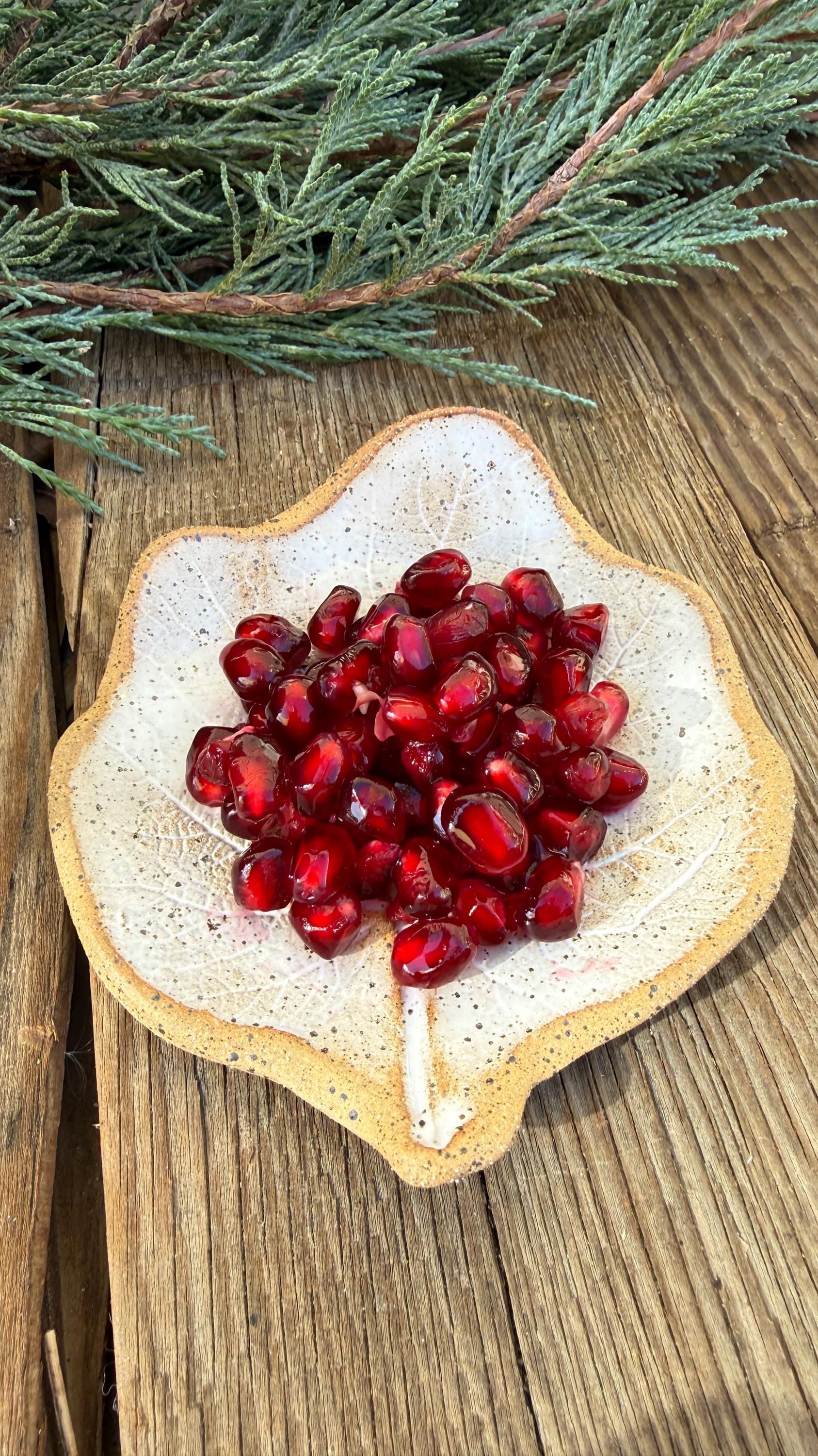 My handmade ceramic stoneware leaves are made from an imprint from real leaves grown in my Colorado garden creating a unique piece from nature. This leaf is made from a hollyhock leaf and shaped into a shallow dish. It is ideal for serving food items such as nuts, candies, fruit, use as a tea bag holder, spoon rest or display as a unique decorative item in your home. The glaze is a rustic soft white that highlights the leaf's natural veins on a speckled stoneware clay. approximately 4 " x 4.5 " and 1" high. It is microwave and dishwasher safe, though I always recommend treating handmade ceramics with extra care. (Pomegranate seeds not included :) )